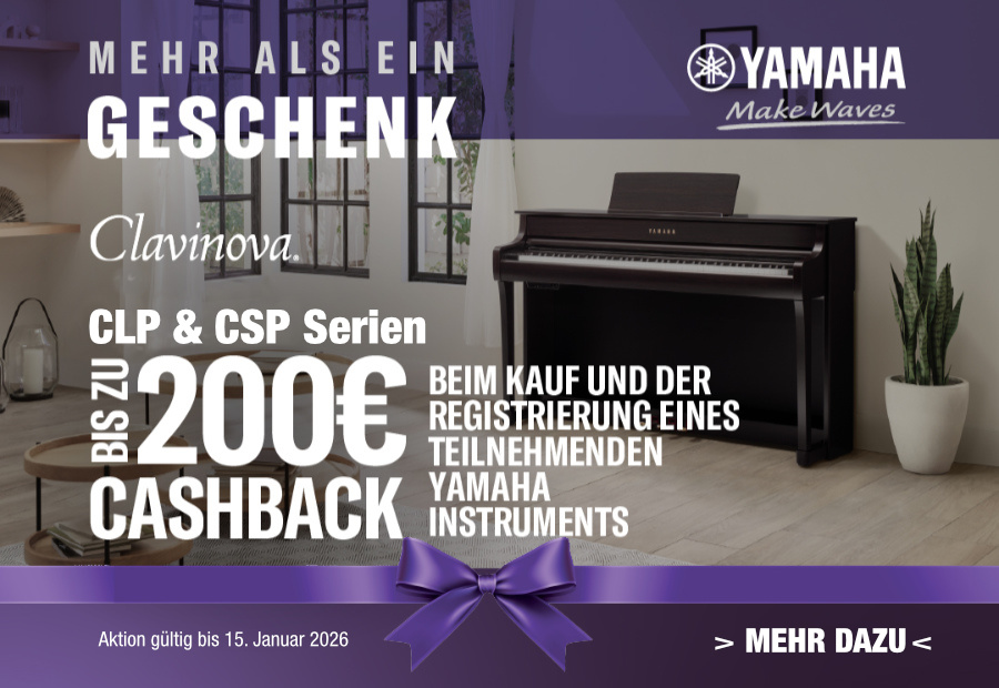 Beim Kauf eines Yamaha CLP-835 bekommst du € 120,– beim Kauf eines Yamaha CLP-845 bekommst du € 150,– Beim Kauf eines CLP 875, CLP 885, CSP 255 und CSP 275 bekommst du € 200,– cashback auf dein Konto!