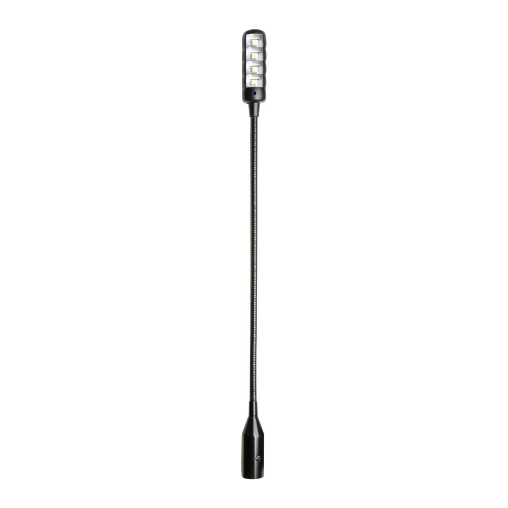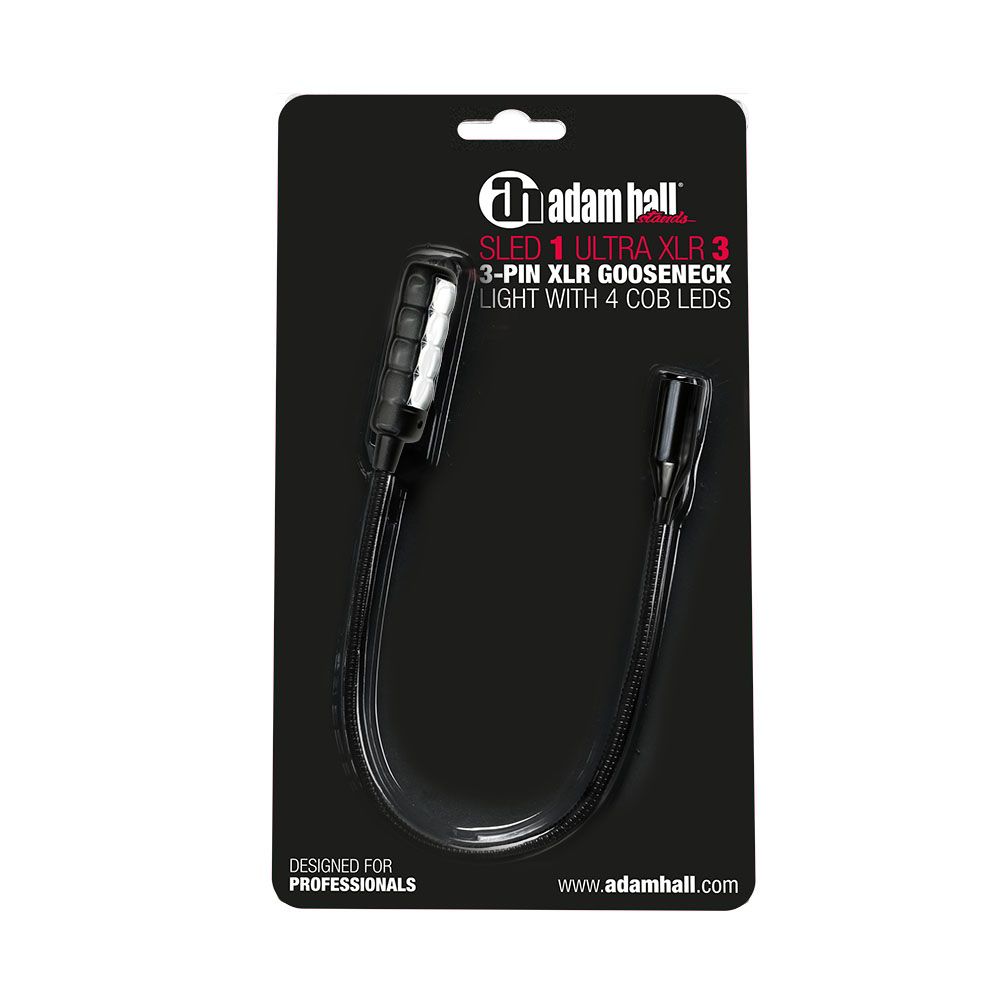 Die SLED 1 ULTRA XLR 3 ist eine mattschwarze Schwanenhalsleuchte mit 4 besonders hellen COB-LEDs und 3-poligem, männlichen XLR-Anschluss. Sie kann mit 12 Volt oder an Mikrofoneingängen mit 48 Volt Phantomspeisung betrieben werden. Der 30 cm lange Schwanenhals läßt sich flexibel, aber stabil ausrichten, der Ein- und Ausschalter sitzt leicht zugänglich auf dem Lampenkopf.