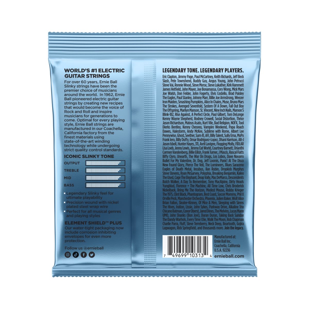 Wie alle Ernie Ball Saiten werden auch die Ernie Ball Primo Slinkys unter höchstem Fertigungsstandard und strenger Kontrolle produziert, um gleichbleibend hohe Qualität, Beständigkeit und maximale Performance zu gewährleisten. Die Wound-Saiten bestehen aus einem mit Nickel plattierten Stahl, der um einen sechskantigen Stahldraht gewickelt ist. Die Plain-Saiten sind aus einem speziell gehärteten und mit Zinn überzogenem hochfesten Kohlenstoffstahl gefertigt.