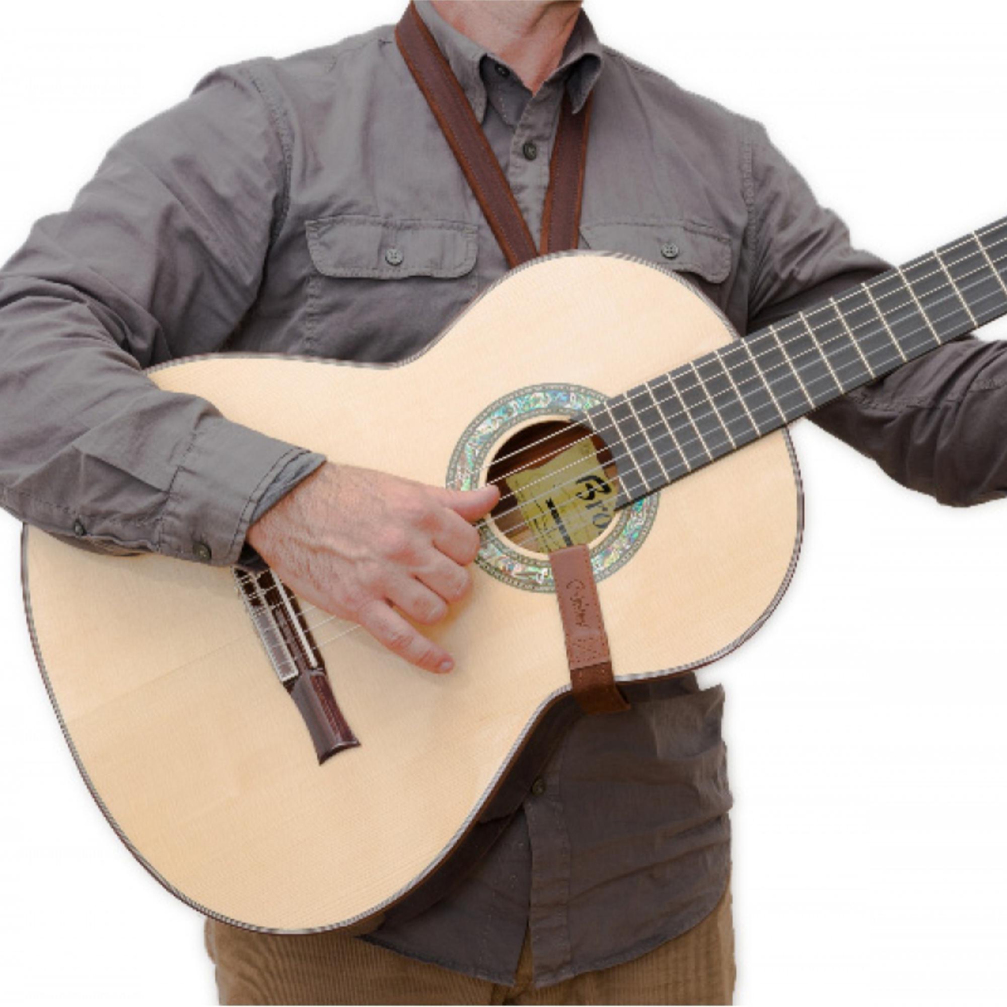 Gurte für klassische oder akustische Gitarre, spanische Gitarre oder akustischen Bass oder Instrumente, die keinen Pin haben, um einen herkömmlichen Gurt zu halten. Mit dem System aus einem oder zwei Haken wird das Instrument an Ort und Stelle gehalten, so dass es leicht im Stehen gespielt werden kann.