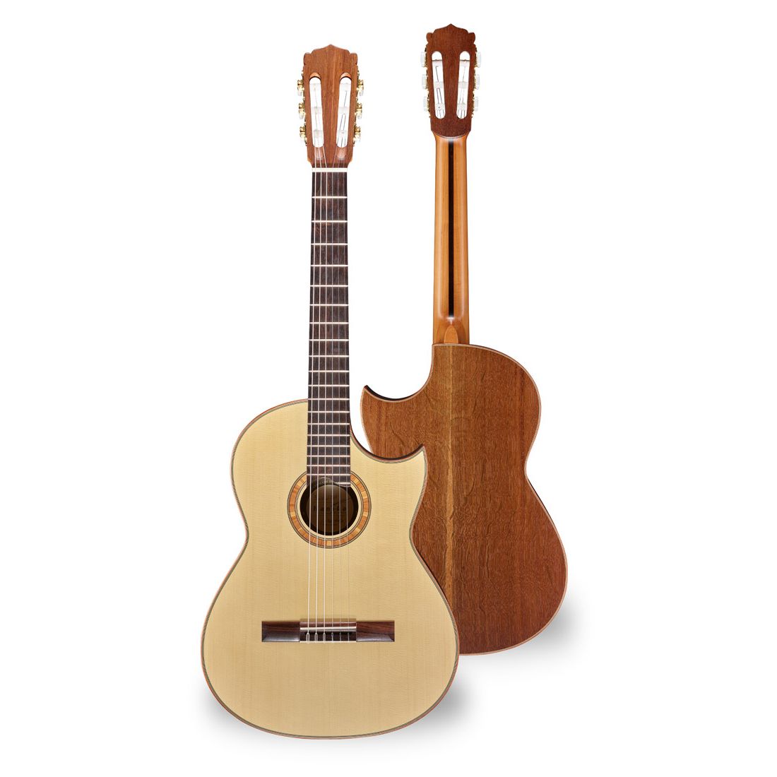 Aus vollmassiven Tonhölzern gefertigt, ist diese Gitarre mit Teflon gelagerter hochwertiger „Rubner-Gold-Mechanik“ und gebuchsten Bohrungen ausgestattet. Qualitätsmerkmale sind zudem der durchgängig mit Ebenholz versperrte Cedro Hals, Ebenholz Griffbrett und Stegsattel aus hartem Knochenmaterial.