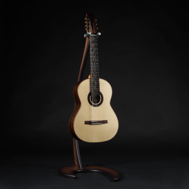 Boden und Zarge gefertigt aus hoch­­wertigem ost­indischen Palisander, Decke aus hoch­­wertigem Fichten­holz. Die Kombination aus Palisander, dem universellsten Klang­holz für Gitarren, und Fichten­holz sorgt bei diesem Model für gutes Attack und satten Ton. Eine zusätzliche Saite sorgt für besonders tiefe Bass­töne. Standard­mäßig wird die Gitarre – kontra H, E, A, D, g, h, e – gestimmt. Für angenehme Spiel­barkeit ist das Spacing leicht vermindert. Klanglich optimiert ist dieses Instrument durch die geschlossenporig matt­lackierte Oberfläche.