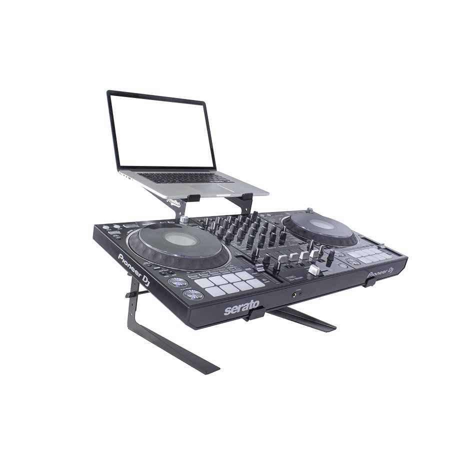 Die untere Ablage eignet sich dank der einziehbaren Arme für DJ-Controller verschiedener Größen. Auf die obere Ablage passen Laptops jeder Größe oder kleinere Controller wie Ableton Push 2, NI Maschine oder Akai MPK225. Die Arme und Beine des Ständers sind mit einer rutschfesten Gummipolsterung ausgekleidet, die für zusätzliche Stabilität und Zuverlässigkeit sorgt.
