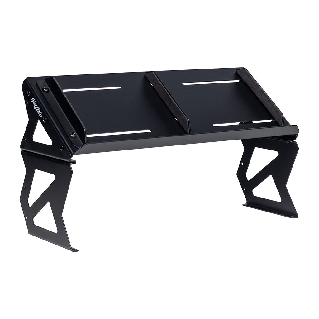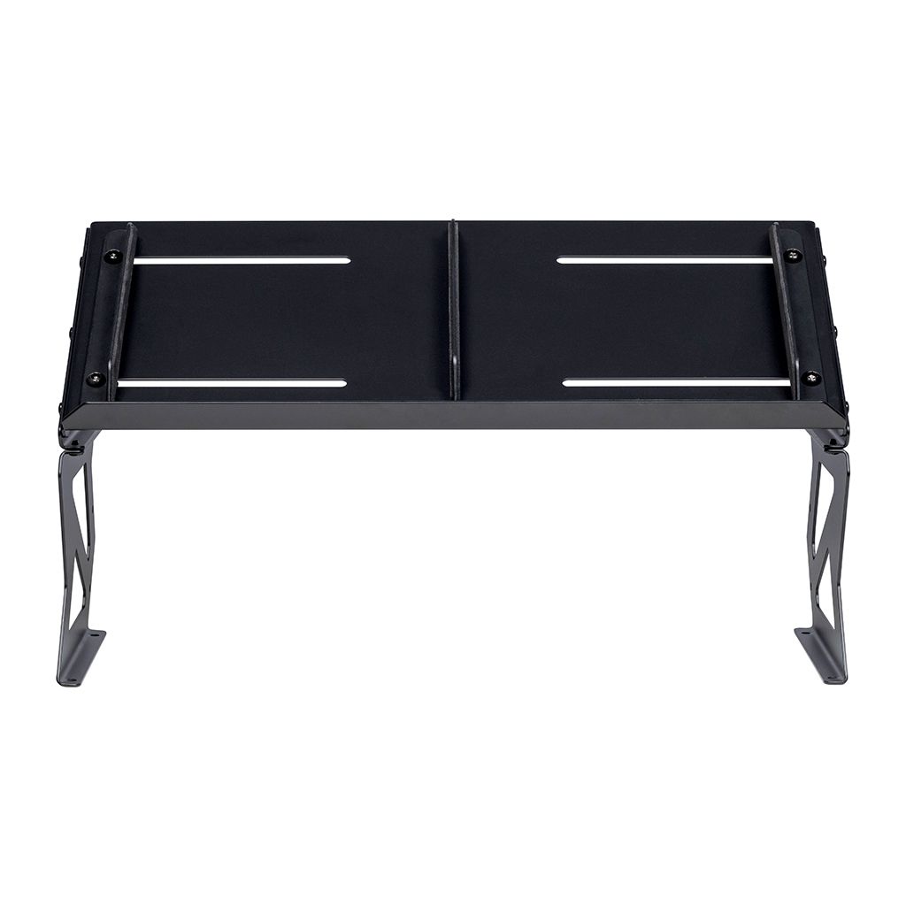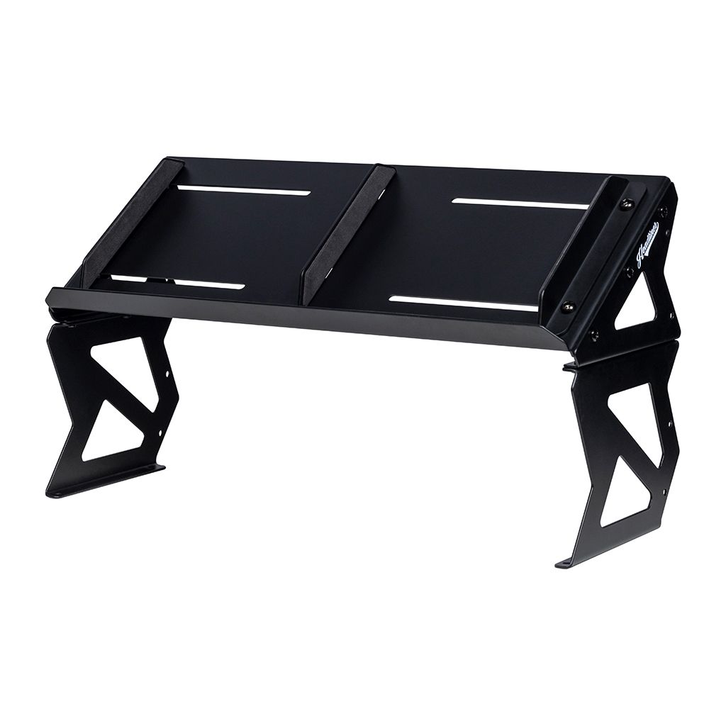 Die verstellbaren Endhalterungen sorgen dafür, dass die Geräte nicht verrutschen, während eine abnehmbare Trennwand in der Mitte dafür sorgt, dass 2 kleine Geräte nebeneinander Platz finden. Der Headliner Mod Riser ist aus massivem Stahl gefertigt und mit rutschfesten Gummipuffern versehen, die den Ständer sicher an seinem Platz halten.