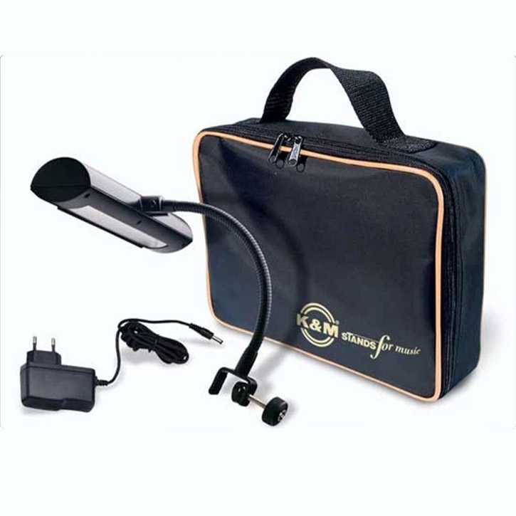 Die batteriebetriebene K&M-Notenpultleuchte 12285-000-55 mit elektronischem Netzteil 12280-000-00 in einer attraktiven Tragetasche.