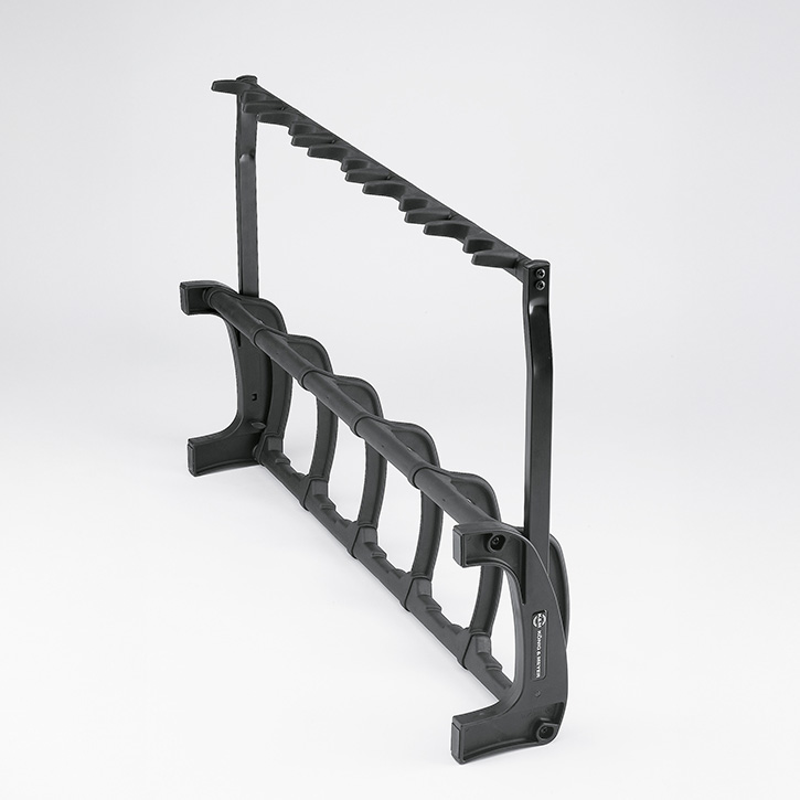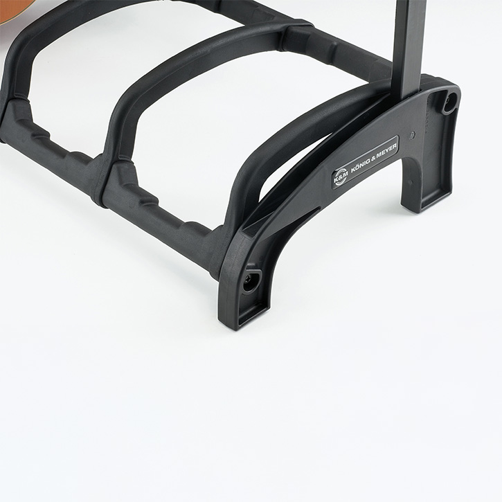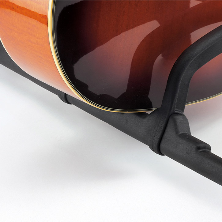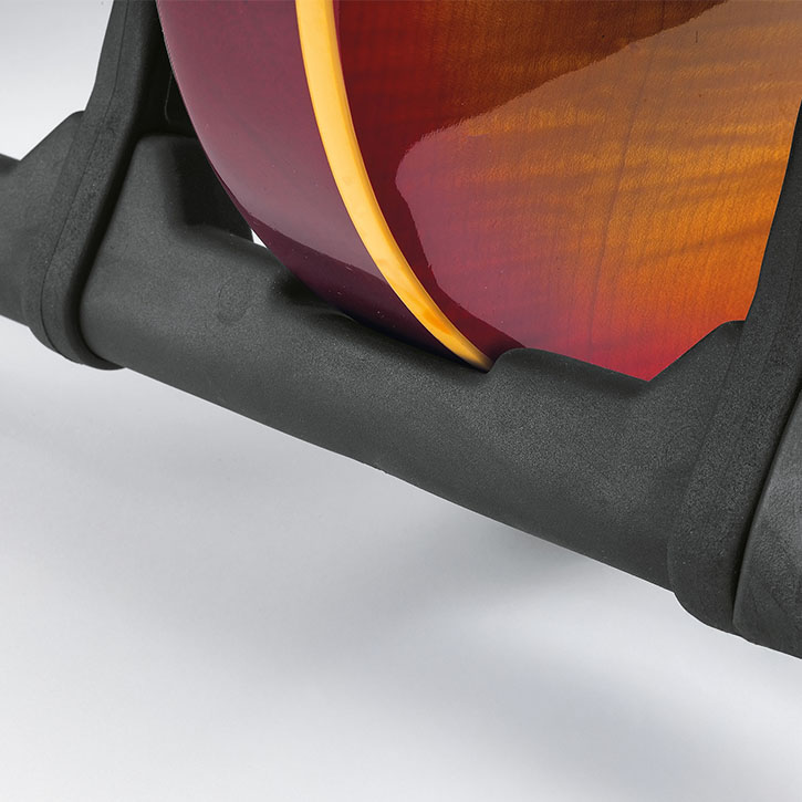 Der ultimative Mehrfachgitarrenständer für viele Einsatzzwecke. Egal ob im Studio, auf der Bühne, im Laden oder in den eigenen vier Wänden. Der »Guardian« hält die verschiedensten Gitarren sicher, platzsparend und übersichtlich für den Musiker bereit. Speziell abgestimmte und dämpfende Auflagen sorgen für einen sicheren und instrumentenschonenden Halt von 5 Gitarren, egal ob Akustik-, E-Gitarre oder Bass. Die flexiblen Schutzbügel verhindern ein Verdrehen der Gitarre und schützen diese beim Abstellen oder Herausnehmen vor einem unbeabsichtigten Anschlagen. Die weichen Auflagepads aus hochwertigem thermoplastischem Elastomer haben dämpfende Eigenschaften. Dadurch nehmen sie das Eigengewicht der Gitarre schonend auf und verhindern Beschädigungen am Instrument. Für den Transport kann der »Guardian« dank eines innovativen Klappmechanismus angenehm getragen und sogar aufrecht abgestellt werden. Hochflexible, unterteilte Anlagearme mit integrierten Plektrenhaltern ermöglichen das schonende beidseitige (rechts oder links) Einstellen der Gitarren und gewährleisten zudem “freiliegende” Saiten. Durch seine vorteilhafte Bauweise kann der »Guardian« auch sehr platzsparend direkt vor einer Wand positioniert werden.