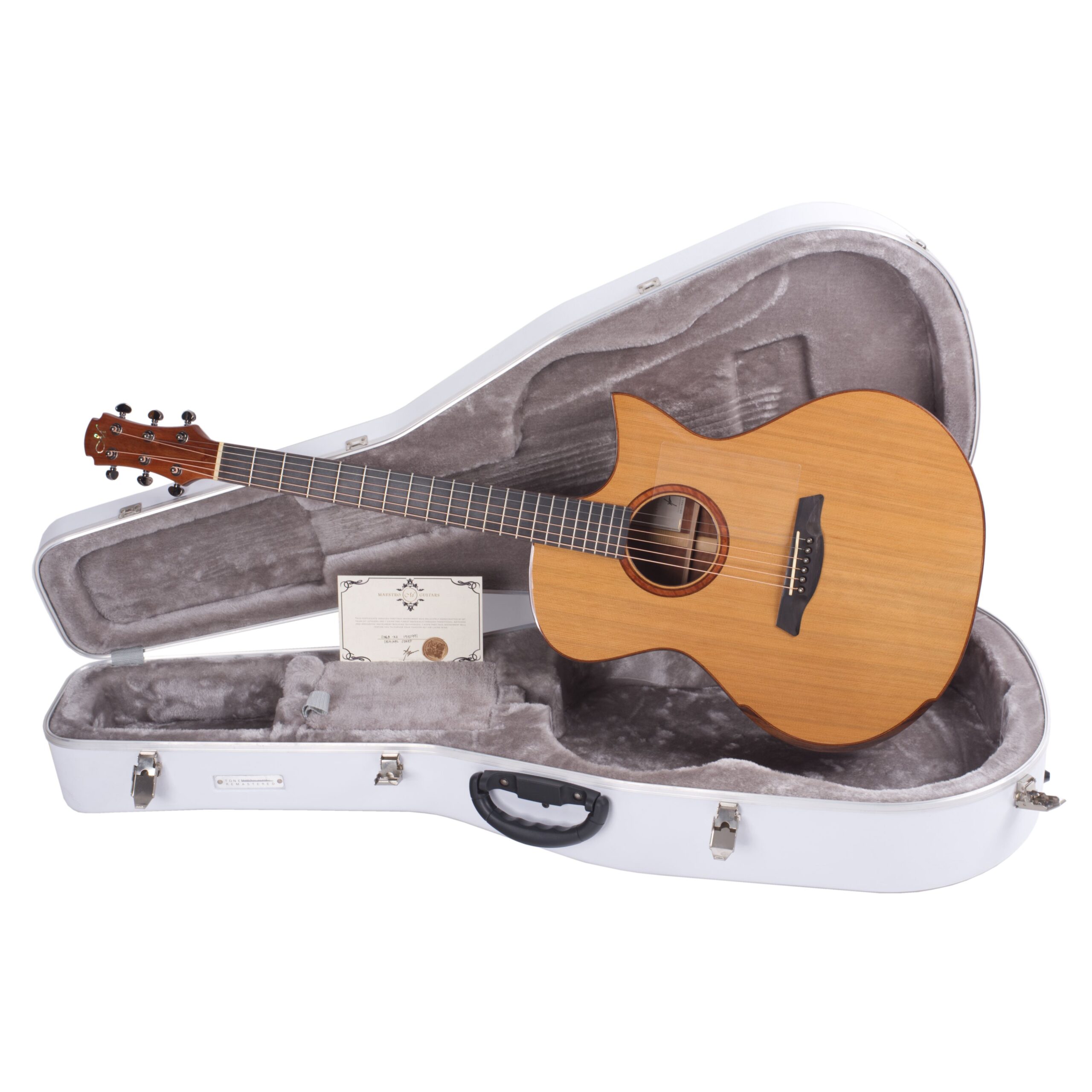 Hier gibt es natürlich keinen einheitlichen Standard, der für alle Instrumente kopiert wird; da jedes Stück Holz einzigartig ist, bestimmt dieser lebendige Werkstoff selbst seine Bearbeitung. Dieses individuelle Procedere des Abstimmens garantiert einen durchgängig ausgewogenen Klang mit angenehmer Transparenz, schneller Ansprache und eleganten Nuancen – eben die Eleganz, die sich auch in der modernen Optik von Maestro Gitarren widerspiegelt.